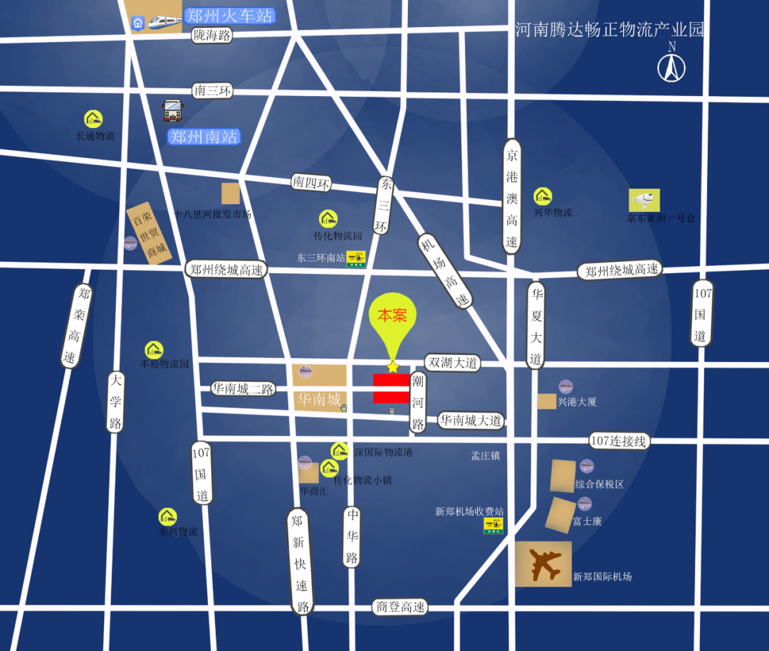 項目位于鄭州市新鄭孟莊鎮(zhèn)潮河路與規(guī)劃二路交匯處,東臨華夏大道、西臨中華路,南臨107連線,北臨雙湖大道,毗鄰華南城商圈,區(qū)位優(yōu)越,交通發(fā)達。
