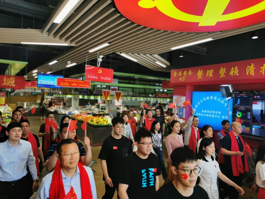 ? ? ? 上午9時,伴隨著悠揚的音樂聲,公司員工一邊揮舞著手中的黨旗,一邊放聲歌唱,緩緩從喧鬧的市場中走出,一場持續(xù)約6分鐘的紅歌“快閃”活動讓濃濃的愛黨愛國情愫涌動在每個人的心里。活動現(xiàn)場,在音樂旋律的感染下,前來購物的市民以及市場商戶也從四面八方匯聚而來,有的掏出手機拍照,有的一起參與,深情的歌聲漸漸演變成大合唱,所有人用慷慨激昂、精神飽滿的歌聲表達(dá)出對偉大中國共產(chǎn)黨的真誠歌頌。大家用紅色的海洋、激昂的情感、高亢的歌聲,展現(xiàn)著新時代共產(chǎn)黨員的風(fēng)采。